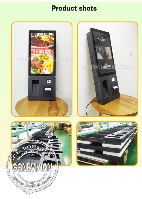The Genevision MG-240ZT-A Self Service Kiosk is made in China and certified by CE, FCC, ROHS, and CCC. The minimum order quantity is 5 pieces, and the price is $404 per unit. The kiosk is packaged in a carton reinforced by plywood box and has a delivery time of 15 working days. Payment terms include T/T and PayPal, and the supply ability is 1000 pieces per month. The kiosk runs on an Android11 RK3568 2G+16G solution and has a Pos machine Install Space that supports wall mount portrait installation.